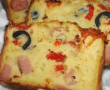 150 g faina 4 oua 3 linguri ulei 1 praf de copt 100 g masline negre 50 g cascaval 250 g bacon 1 ardei rosu sare