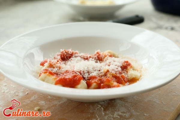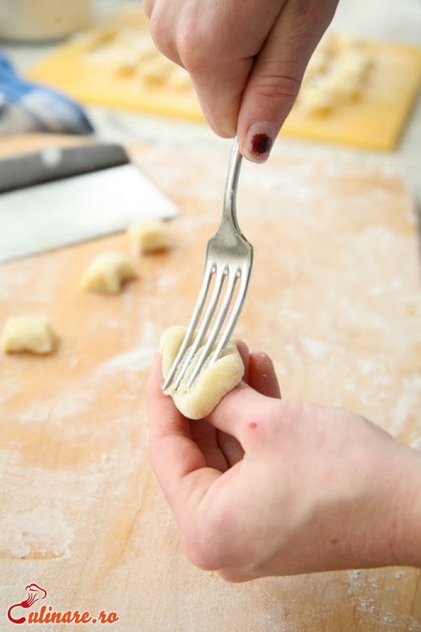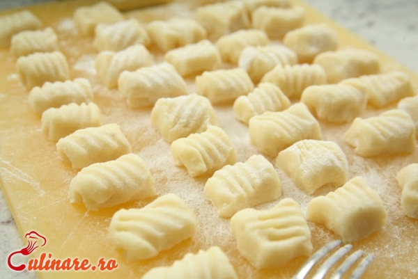 Se iau cartofii, se spala bine si se pun intr-o oala cu apa si sare pe foc, pentru fiert. Din cand in cand cartofii se intepa cu o furculita pentru a verifiva stadiul de fierbere. Dupa ce s-au fiert, cortofii se curata de coaja si se paseaza ca si cum am gati un piure. Cartofii pasati sunt adaugati peste faina ce a fost asezata pe masa, se adauga sare si se amesteca pentru a forma un aluat. Apoi se adauga cele 2 oua si continuam sa amestecam pana cand se formeaza un amestec omogen. Aluatul obtinut se imparte in cilindrii de aproximativ 3-4 cm grosime. La randul lor, cilindrii sunt taiati in rondele de cate 2 cm grosime si se modeleaza cu o furculita. Rondelele de aluat sunt lasate sa stea cam 10 minute. Gatitul lor este foarte usor, acestia se pun in apa fierbinte, cu sare si se fierb. Cand rondelele se ridica la suprafata apei, inseamna ca sunt gata si pot fi utilizati in diferite retete gnocchi cu sos de rosii.