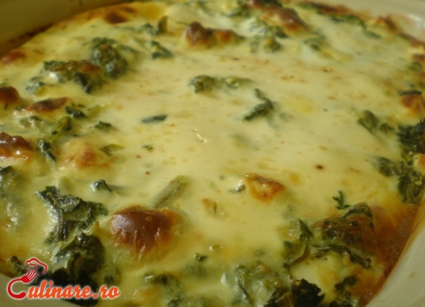 Se spala bine frunzele de spanac in apa rece. Se pun la fiert, timp de 10 minute, cu sare. Apoi, se taie in fasii subtiri si se pregateste sosul bechamel din unt si 2 galbenusuri. Intr-un alt castron, se bat albusurile si se amesteca cu sosul bechamel. Se incalzeste cuptorul la foc mediu si se unge o cratita cu putin unt. Se pune spanacul impreuna cu sosul in cratita. Se lasa timp de 20 de minute la cuptor. Apoi, scoateti din cuptor si lasati 10 minute deoparte. Se rade parmezan si se adauga smantana.
