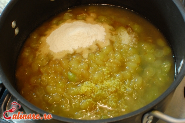 Se folosesc stuguri albi copti care se spala bine si se lasa sa se scurga pentru cateva minute. Broboanele de struguri se curata de coasa si se taie pe jumatate si se scot semintele. Strugurii se pun impreuna cu zaharul intr-un castron mare se amatesca bine dupa care se pune la foc mediu. Cand strugurii s-au incalzit si incepe sa elibereze sucurile lor, dupa aproximativ 5 minute, se adauga sucul de lamaie proaspat stors. Strugurii se lasa pentru 45 de minute la foc mediu, amestecand ocazional, pana cand se ingroasa dulceata. Dulceata se toarna fierbinte in borcane si se fileteaza. Se acopera borcanele si se lasa cu capul in jos pana a doua zi.