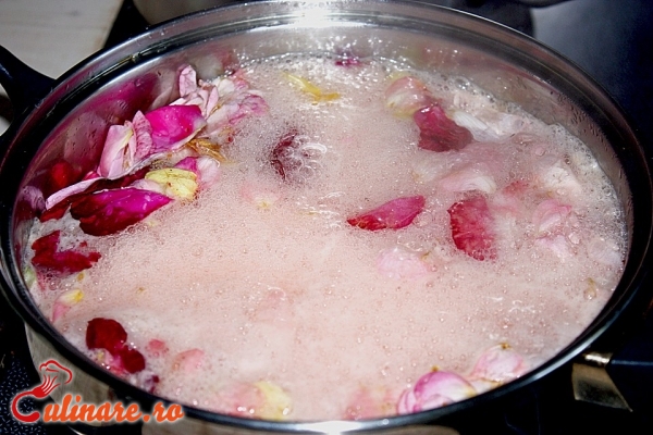 250 g petale de tradafir rosu 250 g zahar o lamaie 2 linguri de apa