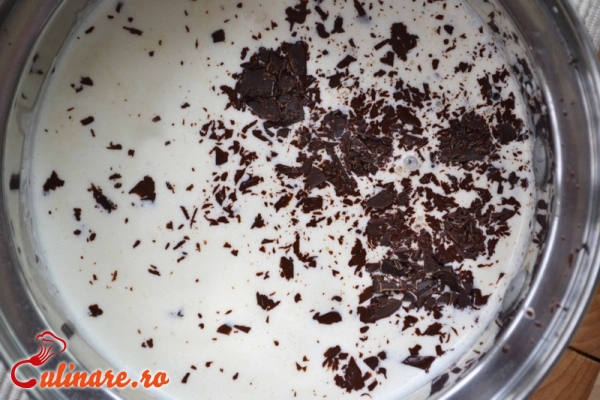 500 ml lapte 1 pahar zahar pudra 100 g ciocolata amaruie 2 galbenusuri 1 ou 150-200 g frisca