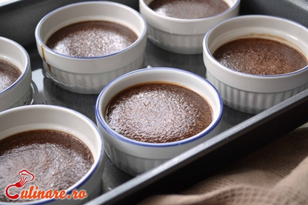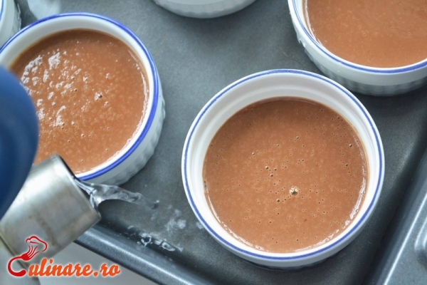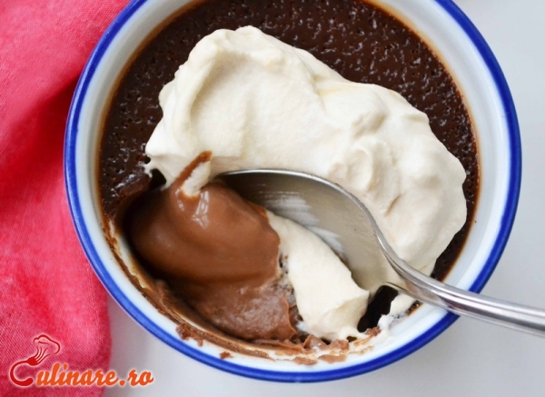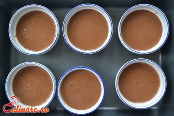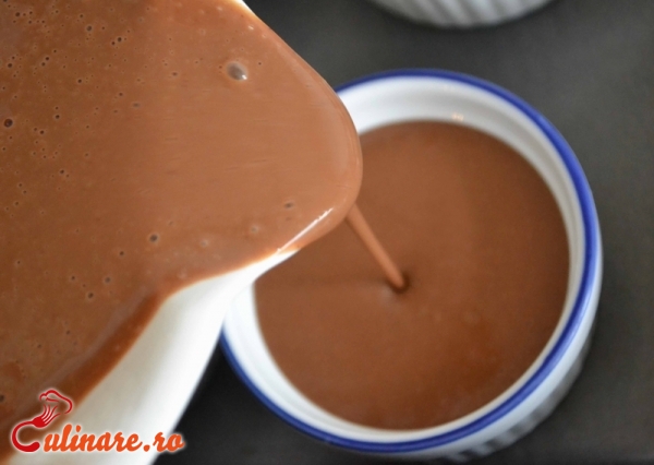 Se freaca galbenusurile si oul cu jumatate din cantitatea de zahar. Separat, se dizolva restul de zahar in laptele fierbinte, la care se adauga ciocolata tocata marunt, iar dupa ce se amesteca bine, se combina cu prima compozitiei. Se bate totul cu telul, apoi se toarna crema in cescute sau forme mici si se asaza intr-o tava cu apa fierbinte care sa ajunga doar pana la jumatatea cestilor. Se introduce tava la cuptor, la foc potrivit pana cand crema este gata. Dupa ce se raceste complet, cestile sau formele se dau la frigider. Crema de ciocolata din forme se rastoarna pe farfurioare de desert. Se orneaza cu frisca.