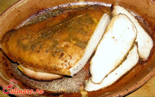 2 kg piept de curcan 5 g boabe de mustar 5 g boia dulce 5 g cimbru 5 g ienibahar 4 catei de usturoi 5 g boabe de piper 20 g ulei 1 lamaie sare