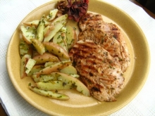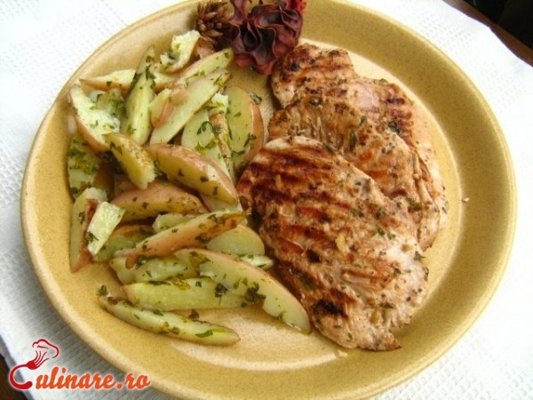 Se pune pieptul de pui la marinat, timp de o ora, in ulei de masline condimentat cu sare, piper si putin boia de ardei! ... (mai mult)