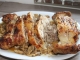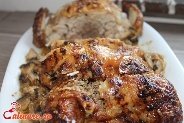 Mai intai pregatim puiul pentru gatit, curatandu-l in interior si indepartandu-i extremitatile. Carnea tocata se amesteca impreuna cu patrunjelul tocat, ciupercile feliate prazul rondele si condimente. Cu umplutura de carne, umplem puiul in interior, apoi il condimentam si pe deasupra cu boia, piper si putina sare si il asezam in tava. Turnam 2 linguri de ulei peste pui si dam tava la cuprot. in timp ce gatim puiul, turnam si vinul de preferinta alb, in mai multe etape, astfel incat sa patrunda mai bine in carne. Dupa aproximativ 40 de minute, cand s-a facut, oprim focul si putem servi.