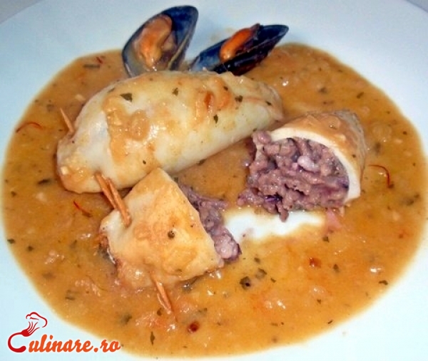 10 calamari 400 g carne tocata 10 midii 1 pahar de vin alb 1 rosie 1 ceapa mare 2 catei de usturoi pesmet sofran faina patrunjel piper negru sare