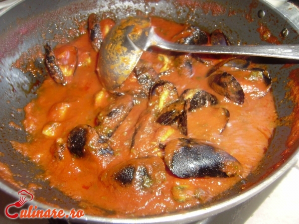 Intr-o tigaie, se calesc in uleiul de masline ceapa si ustoroiul taiate marunt. Adaugati apoi rosiile si lasati la fiert timp de 10 minute. Dupa ce sosul se ingroasa se adauga midiile si se continua fierberea timp de aproximativ o jumatate de ora. Se condimenteaza dupa gust cu sare si piper si se presara cu patrunjel tocat. Servi midiile cu sos, alaturi de un vin alb, sec.