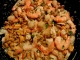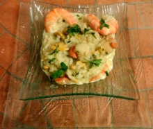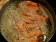 o cana de orez 12 stridii fara cochilie 1 catel de usturoi 1/2 ceapa 3 linguri ulei de masline 1 pahar vin alb o cana supa de legume o rosie decojita 6 creveti 3 linguri parmezan ras 2 linguri unt sare piper