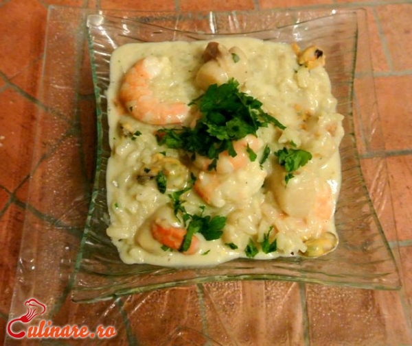 Intr-o tigaie, la foc mare, se incalzeste putin ulei de masline si se gatesc stridiile timp de 2 minute. Apoi, se scot stridiile, iar in uleiul ramas se pune ceapa tocata impreuna cu un catel de usturoi. Se adauga orezul si 1 pahar de vin alb. Odata absorbit vinul, dupa aproximativ 20 de minute, se adauga rosia decojita si se amesteca constant. Cand orezul ajunge la forma dorita, se aduaga fructele de mare si se condimenteaza cu sare si piper. Apoi, se aduaga parmezanul si untul si se amesteca bine. Se serveste cald!