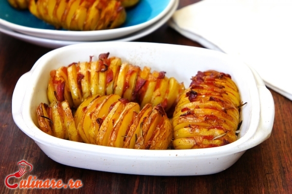 Cartofii ii curatam si ii taiem in fasii mai groase, dar fara a le taia definitiv, ci doar cat sa formam un evantai din feliile cartofului. Cartofii crestati, ii asezam intr-o tava, ii condimentam cu piper, sare, ii ungem cu unt, ii acoperim cu o folie de aluminiu si ii dam la cuptorul incins. Dupa aproximativ 15 minute, feliile cartofilor vor incepe sa se rumeneasca si se vor departa una de alta. Acum este momentul bun de a aseza felii de bacon intre feliile de cartofi. Ii stropim din nou cu putin unt topit si lasam la cuptor inca 15 de minute, pana cand baconul se rumeneste. Cand sunt gata, se scot pe o farfurie si se servesc impreuna cu putin cascaval ras, sau permezan.