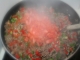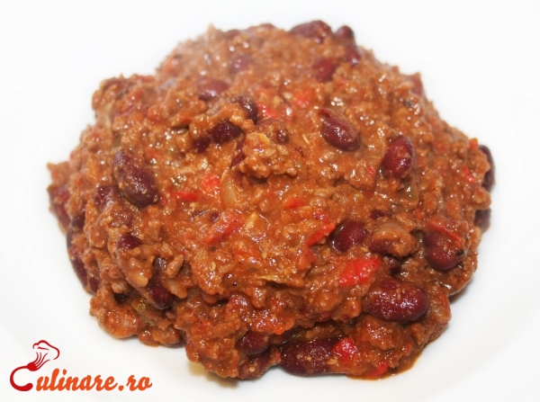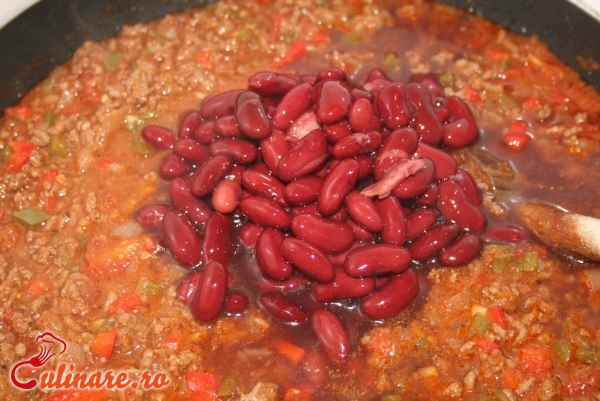 1 bucata carne de vita (sau carne tocata de vita) 2 conserve fasole boabe rosii 1 cana bulion 1 ceapa 8 catei de usturoi 1 lingurita boia de ardei 4 linguri ulei de masline sare piper