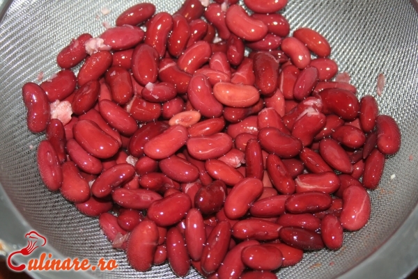 Intr-o cratita, se pune usturoiul pisat impreuna cu 4 linguri de ulei, boia de ardei, sare si piper. Se amesteca bine si se adauga carnea de vita. Se lasa la marinat timp de o ora. Apoi, se toaca ceapa marunt si se pune la rumenit intr-o tigaie cu putin ulei si un catel de usturoi pisat. Se taie carnea cubulete si se adauga in tigaie. Se amesteca bine si se lasa la fiert timp de 4-5 minute. Se adauga bulionul si se mareste focul. Dupa 30 de minute, se aduaga boabele de fasole si se mai lasa pe foc putin. Se condimenteaza cu sare si piper. Se serveste mancarea calda!