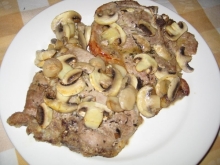 Ciupercile se taie in felii si se fierb 10 minute in apa cu putina sare. Se scot cu spumiera si se pun intr-un castron. Cotletele foarte putin sarate se pun intr-o tava cu ulei si o cescuta apa, se introduc in cuptor stropindu-se din cand in cand cu sucul din tava. Se lasa pana ce carnea este aproape gata. Peste carne se pun ciupercile, se adauga vinul, sare si piper dupa gust si se mai lasa 30 minute la cuptor la foc potrivit.
