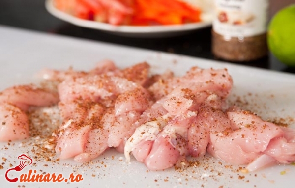 4 tortillias 500 g piept de pui 1 ardei gras 1 ceapa rosie 200 g porumb 50 ml smantana ulei de masline patrunjel sare piper Marinata: 10 g mustar 1 lamaie oregano boia iute 1 ardei iute 1 lingura zahar