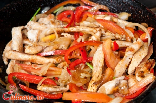 Amestecam toate incredientele pentru marinata, apoi punem pieptul de pui taiat fasii si amestecam. Vom tine pieptul de pui, la marinat in jur 30 minute. Cat timp sta carnea la marinat, curatam legumele, le taiem in fasii subtiri, iar patrunjelul il tocam marunt. Intr-o tigaie, in care am incins ulei, calim legumele, iar cand s-au innabusit, adaugam puiul si le gatim impreuna cam 10 minute. La final punem boabele de porumb, sare si piper si dam de pe foc, punem smantana si e gata. Umplem tortillias cu amestecul preparat si le rulam formand un cornet inchis la baza, pentru a nu iesi din umplutura.