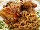 1 gaina 200 g ciuperci 150 g orez 1 lingurita boia 200 ml zeama de carne 100 g unt 1 ceapa 1 morcov sare