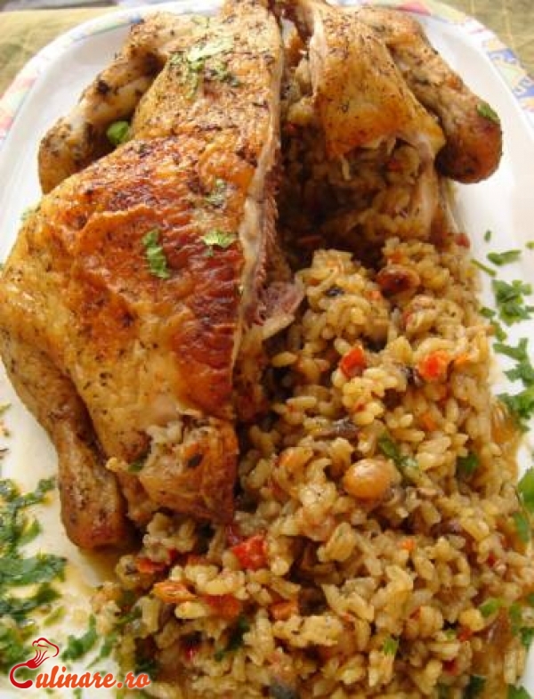 Orezul se spala si se pune la fiert, impreuna cu ciupercile taite in doua, in zeama de carne. Se adauga untul si sare peste orez, se amesteca si se obtine astfel umplutura pentu gaina. Gaina, dupa ce a fost curatata, spalata si lasata la scurs, se va umple cu compozitia de orez, apoi cusuta pentru a o putea aseza in tava. Intr-o tigaie, se caleste ceapa si morcovul si lingurita de boia. Se pun lagumele proaspat calite peste gaina si se da tava la cuptorul incins. In timpul in care se tine la cuptor, se stropeste gaina cu sosul din tava, cu ajutorul unei linguri. Cand s-a rumenit, gaina se scoate din tava, se taie in portii si se serveste alaturi de o salata.