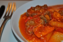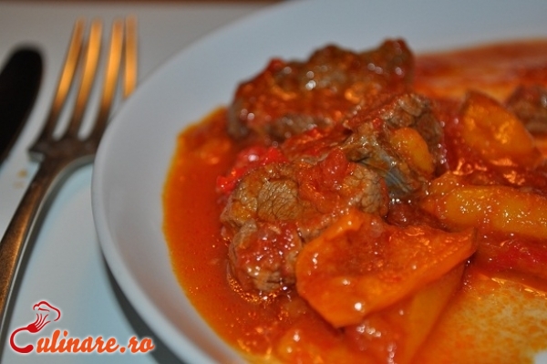 Intr-o cratita, se pune la topit untul si se amesteca cu uleiul. Apoi, se pune la rumenit carnea, taiata in bucati nu foarte mari. Se adauga si costita afumata, taiata cubulete. Dupa ce s-a prajit putin, se scoate carnea si se lasa deoparte. In cratita in care s-a prajit carnea, se pune ceapa la rumenit impreuna cu morcovul taiat felii, usturoiul pisat si putina sare si piper. Dupa 2-3 minute, se aduaga rosiile decojite si se amesteca bine. Apoi, se pune ardeiul gras, tocat cubulete, carnea si se adauga apa. Se lasa sa fiarba, iar in ultimele 20 de minute se adauga cartofii taiati cubulete. Se adauga o lingurita de boia dulce, patrunjel si se serveste cald!