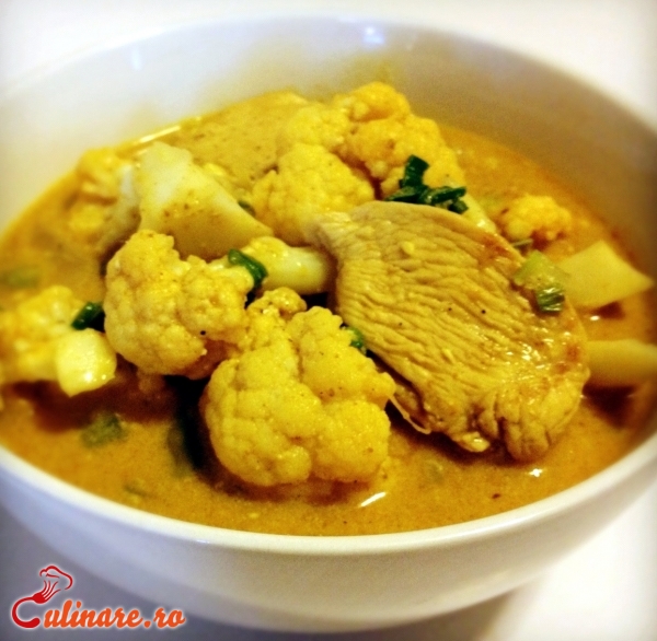 Se spala bine conopida si se rupe in buchetele mai mici. Apoi, se pun la fiert si se adauga o lingurita de sare. Intre timp, se fierbe pieptul de pui. Cand s-a fiert, se lasa putin sa se raceasca si se taie in bucati mai mici. Se condimenteaza si se pune in tigaie imrpeuna cu putin ulei si usturoi pisat. Dupa cateva minute, se toarna in tigaie 200 ml apa in care a fiert conopida si se adauga pasta de tomate si patrunjelul tocat marunt. Se lasa la fiert timp de 20-30 de minute, la foc mic! Daca scade sosul, se mai adauga apa. La final, se pun si buchetelele de conopida si se amesteca bine. Se mai lasa pe foc 5-10 minute. Intre timp, se amesteca separat putina smantana cu sos in care fierbe puiul si se toarna peste mancare.
