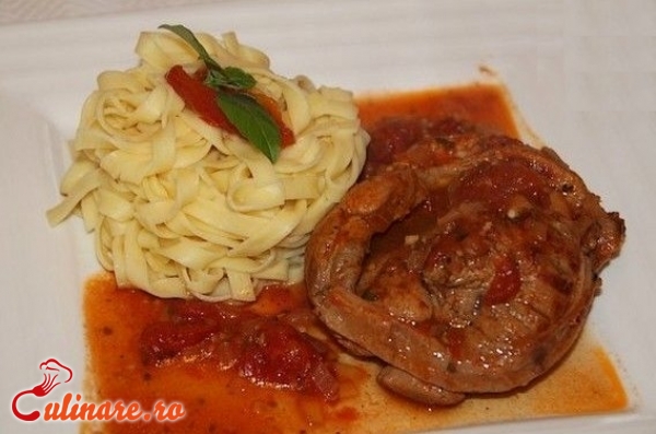 Tocam ceapa marunt si o calim intr-o tigaie in care am incins untul. Peste ceapa, asezam si feliile de vitel, si turnam peste ele un pahar cu apa in care am dizolvat faina, lasand la prajit totul. Condimentem cu sare, adaugam si bulionul impreuna cu rosiile si acoperim cu un capac. Tinem pe foc carnea, cam 80 de minute. Intre timp pregatim gremolada, in care amestecam toate ingredientele. Cand pulpa de vitel este gata, adaugam peste si gremolada preparata, se amesteca bine si se mai lasa 5 minute pe foc mic. Se serveste alaturi de paste.