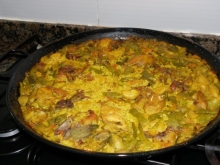 Carnea de pui de rumeneste intr-o cratita mai inalta cu putin ulei. Cand pieptul de pui a inceput sa se faca, se va turna peste el cam un litru de apa. Intr-o tigaie se vor cali anginarele, ardeii, rosiile si usturoiul. Peste legume se va pune si orezul, care a fost splat in mai multe ape in prealabil, se amesteca impreuna cu legumele si se lasa la fiert. Cand aproape s-a fiert carnea, peste ea se va pune si amestecul de legume si orez, se mai adauga un pahar de apa si se lasa la inabusit inca 20 de minute. Se condimenteaza cu sare, piper, cimbru, rozmarin si patrunjel, iar dupa inca 10 minute, este gata.