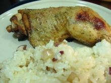 Curatam pulpele, le spalam, le indepartam piela si le condimentam, dupa gust. Tocam ceapa si morcovul marunt si le punem intr-o tigaie, pe foc. Cand ceapa a devenit transparenta, iar morcovul s-a inmuiat, punem si pupele si le lasam la prajit, impreuna cu legumele. Dupa aproximativ 10 minute, turnam un pahar de apa si dam focul mai mic. Separat, spalam orezul, si il punem la fiert cu putina sare si ulei. Cand orezul e aproape gata, adaugam peste el pulele cu legume, le amestecam si dam cratita la cuptor cam pentru 20 de minute. Cand s-au facut, scoatem cratita si servim orezul cu pulpe si legume, cald.