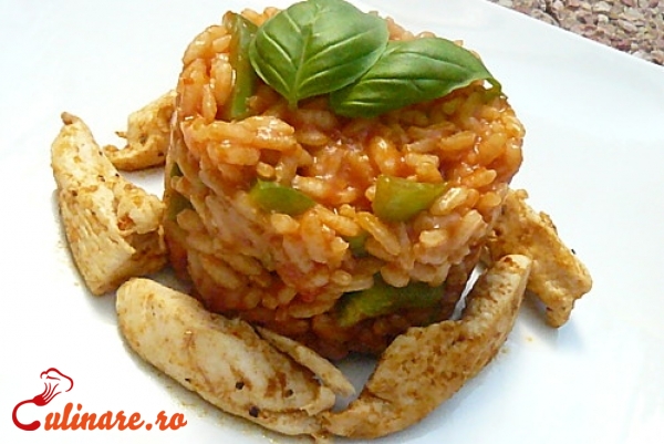 Se taie ceapa si ardeiul gras. Se pun intr-o tigaie cu putin ulei de masline. Dupa 2-3 minute, adaugati bucatile de pui cu putina sare si piper si usturoiul pisat. Amestecati, apoi puneti un pahar de vin alb si orezul. Se toarna supa de pui si se lasa aproximativ 40 de minute, la foc mediu. Intre timp, taiati parmezanul in cubulete si adaugati-l in tigaie. Cand s-a fiert orezul si s-a redus supa de pui, stingeti focul.