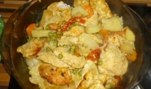 Se curata cartofii si se taie cubulete. Se decojesc rosiile. Apoi, intr-o cratita, se pun cartofii la fiert si se adauga carnea de pui. Odata fierte, se taie carnea de pui in bucati mai mici si se pune inapoi in cratita impreuna cu ceapa tocata si rosiile decojite. Se adauga o cutie de bulion si se amesteca bine. Apoi, se pune mazarea, morcovul feliat, ardeiul gras taiat cubulete, ceapa tocata marunt, sare si piper. Dupa 5 minute, se adauga si cartofii. Se acopera si se lasa la fiert timp de 15 minute, la foc mic.