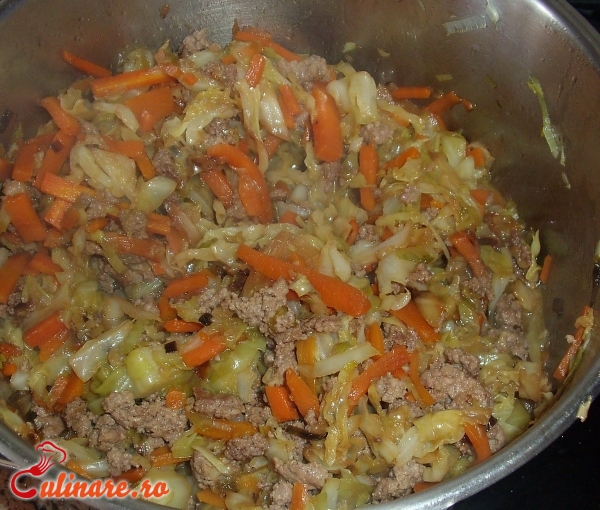 1 varza 3 morcovi 300 g carne de porc 5 linguri bulion 3 linguri ulei sare piper