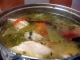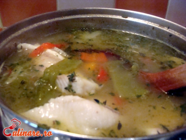 Se curata si se taie pestele. Apoi, intr-o cratita, se pune la fiert 5 litri de apa impreuna cu ulei, otet, legumele taiate, usturoi, patrunjel si bulion. Intre timp, se pune pe gratar pestele. Dupa ce au fiert aproximativ o jumatate de ora se adauga pestele copt, se sareaza si se mai presara patrunjel.