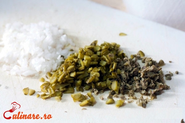 300 g somon proaspat 1 ceapa mica 50 g muraturi 1 galbenus de ou 30 g capere sare piper