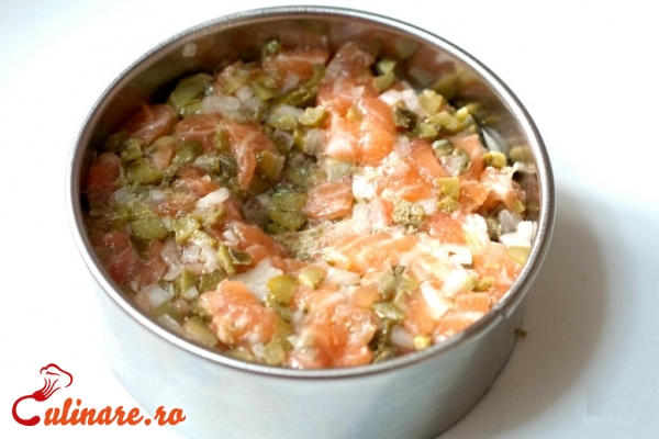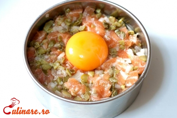 Se toaca foarte marunt muraturile si caperele. Se curata somonul de piele si oase. Tepii sunt mari si pot fi indepartati usor! Apoi, taiati-l in bucati mai mici. Adaugati putin piper in muraturile tocate amestecate cu somonul. Cu ajutorul unui inel, da-ti forma preparatului. Faceti o gaura in mijlocul acestuia si puneti acolo un galbenus de ou. Este foarte important ca ingredientele sa fie reci, daca nu se adauga gheata zdrobita!