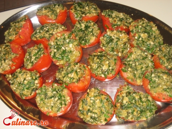 Vinetele se coc pe gratar, apoi se curata de coaja si se toaca fin. Pasta de vinete se amesteca impreuna cu ceapa data pe razatoare, putin ulei, sare si piper. Adaugam si patrunjelul tocat si omogenizam compozitia. Rosiile se spala si li se taie capacul, li se inlatura continutul, apoi se umplu cu amestecul de vinete. Se servesc imediat.