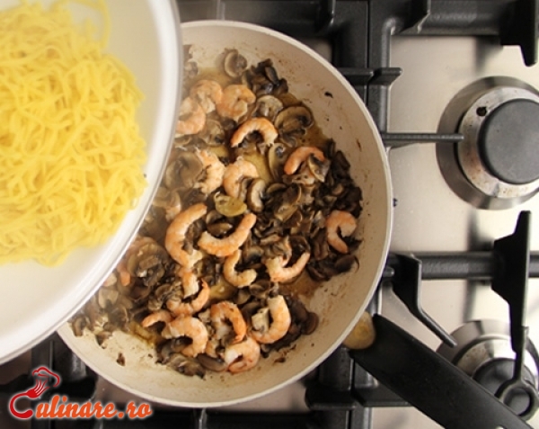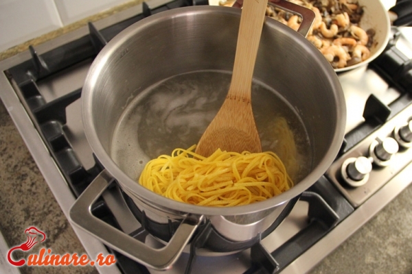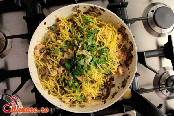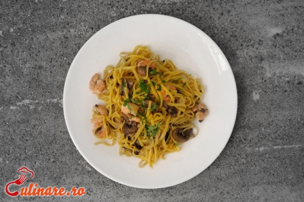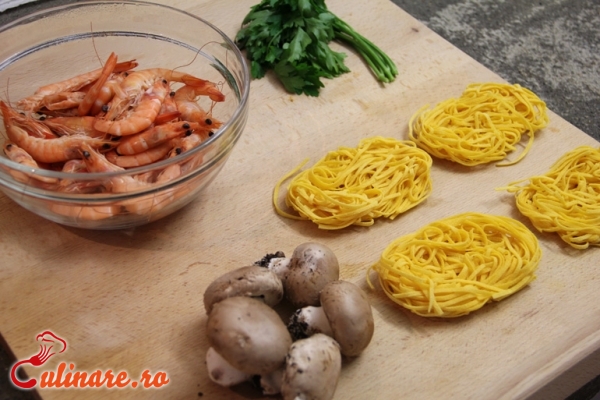 400 g tagliatelle 250 g creveti 250 g ciuperci ulei de masline patrunjel bere usturoi sare