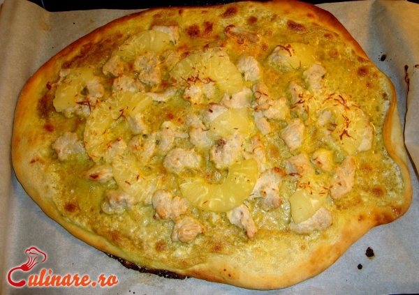 Aluatul se prepara amestecand toate ingredientele, impreuna cu drojdia dizolvata cu o lingurita de zahar. Se framanta bine, apoi se lasa la crescut cel putin 20 de minute. Pregatim si umplutura tocand in cubulete pieptul de pui, pe care l-am rumenit intr-o tigaie cu putin ulei de masline, ananasul si ardeii. Cand a crescut, intindem aluatul intr-o foaie cat suprafata tavii in care il vom coace si punem deasupra carnea, ananasul, ardeii si branza rasa. Pizza va sta la cuptor in jur de o jumatate de ora, putand fi apoi, servita.