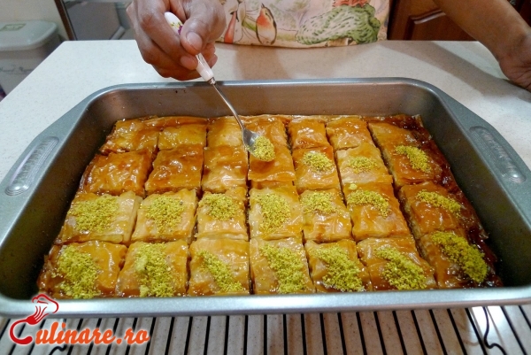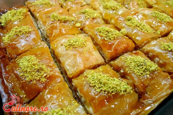 Aluatul: 1 kg faina un ou o lingurita rasa sare 350 g unt sau ulei apa calduta 1 kg foi de placinta din comert Umplutura: 500 g nuci macinate 750 g zahar 3 pahare apa 200 g stafide 1 pahar visine dulceata o lamaie 2 pachete zahar vanilat