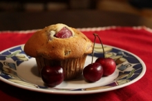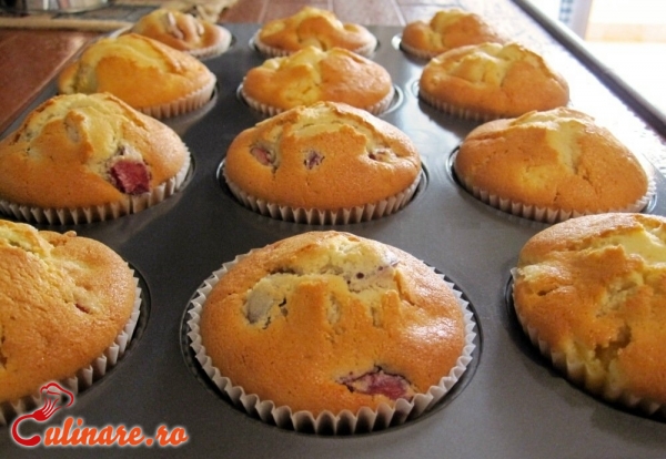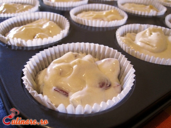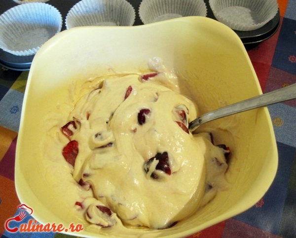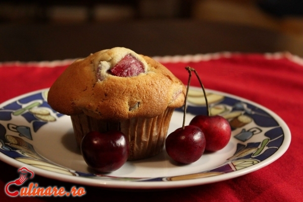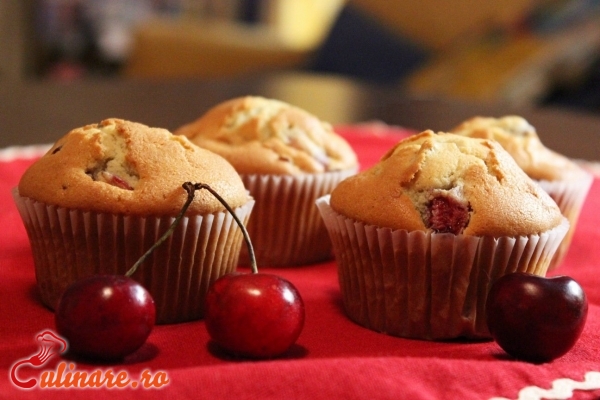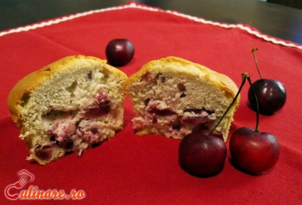 Se spala visinele si se taie in bucati mici. Se amesteca cu zaharul, faina, praful de copt si scortisoara. Se adauga laptele, iaurtul si oul. Se amesteca bine cu telul. Apoi, se toarna compozitia in forme de briose. Se baga briosele la cuptorul incalzit la 200 de grade. Se lasa la copt, timp de 25 de minute, la o temperatura de 180 de grade. Cand sunt gata se decoreaza cu putin gem de visine.