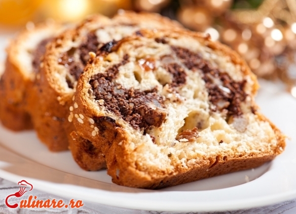 500 g de faina 100 g zahar 100 g stafide 300 g rahat 200 ml suc de portocale 30 g margarina 300 g nuca pisata 20 g cacao 50 g zahat pudra 40 g de drojdie esenta de vanilie esenta rom coaja rasa de lamaie sare