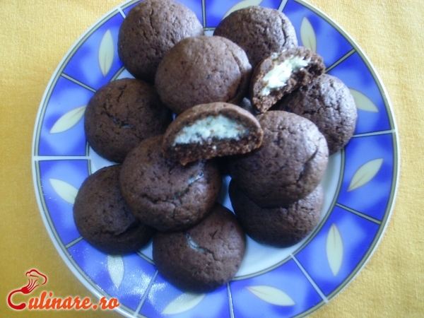 Aluat: 200 g unt 2 oua 200 g zahar 40 g cacao 1 praf de copt rom 500 g faina Umplutura: 100 g nuca de cocos 1 albus 100 g zahar pudra 20 g unt
