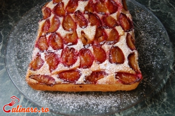 Pentru aluat, se pun intr-un bol faina, laptele, drojdia, zaharul, oul, coaja de lamaie si un praf de sare si se amesteca impreuna, pana ce se obtine o compozitie consistenta, apoi se lasa la crescut, cam jumatate de ora. Dupa ce a crescut suficient, aluatul se intinde intr-o foaie si se aseaza intr-o tava unsa cu ulei. Peste acesta se pun jumatati de pruna si se da tava la cuptor. Intre timp se pregateste crema care se prepara punand mai intai laptele la fiert impreuna cu zaharul, iar cand s-a dizolvat zaharul definitiv, se presara grisul si se amesteca mereu, pentru a nu se lipi. Peste acestea, dupa ce s-a oprit focul, se pun cele 2 galbenusuri amestecate cu putina vanilie si se amesteca bine, iar cand s-a mai racit crema, se adauga smantana si albusurile batute spuma si se incorporeaza usor, totul. Cand s-a rumenit suficient prajitura, adica dupa aproximativ jumatate de ora, se scoate tava din cuptor, peste prajitura se intinde crema de gris, se uniformizeaza stratul de crema, apoi se da pentru inca 10 minute la copt.