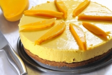 Se pune la incalzit cuptorul la 300 de grade. Apoi, se sfarama biscuitii, iar untul se topeste intr-o craticioara, la foc mic. Intr-un castron, se pun firimiturile de biscuiti impreuna cu untul si se amesteca bine. Apoi, se pun biscuitii intr-o tava rotunda si se preseaza. Se coace timp de 10 minute, apoi se lasa la racit. Pentru umplutura, se toarna gelatina impreuna cu apa, intr-un castron, se lasa sa stea 5 minute pana cand se ingroasa. Se pune la foc mic, amestecand, pana se dizolva. Apoi, se taie fructele de mango in 4 bucati si se piseaza in blender. Se aduaga branza, laptele, zeama de lamaie, iaurtul si gelatina. Se amesteca bine! Amestecul obtinut se toarna peste biscuiti si se baga la frigider. Se poate servi dupa ce se incorporeaza.