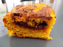 Mai intai spargem cele trei oua si le batem bine cu un mixer. Intr-un bol, punem faina cernuta impreuna cu untul topit, praful de copt, zaharul si sarea si amestecam. Peste toate, turnam si ouale si incorporam usor pana obtinem o crema consistenta, din care vom monta prajitura. Astfel, turnam crema intr-o tava tapetata cu unt, realizam mici adancituri cu ajutorul unei lingurite, iar in fiecare adancitura, vom pune crema de ciocolata. Prajitura o vom da la cuptor, timp de jumatate de ora, iar cand este gata, se lasa sa se raceasca, apoi se portioneaza si se serveste.