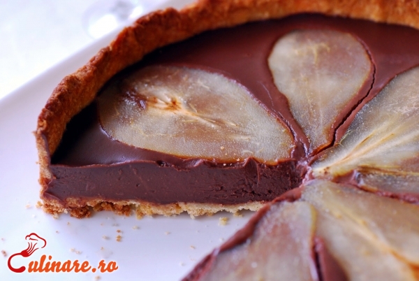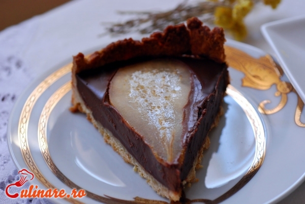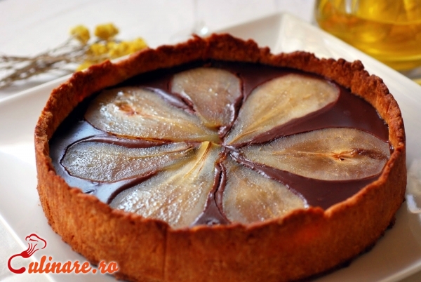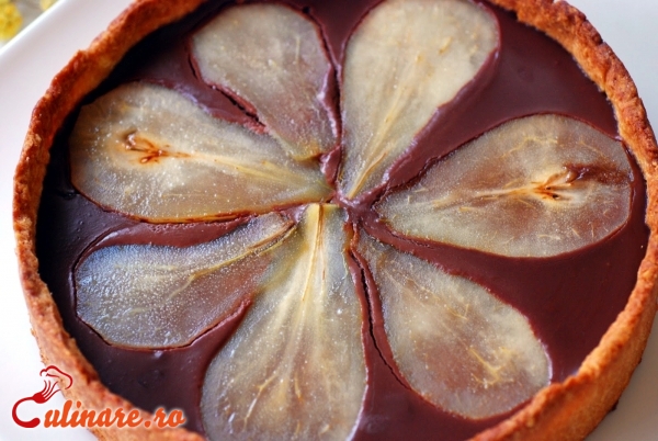 Se pun intr-un blender fulgii de migdale impreuna cu zaharul, untul, un praf de sare si 3 lingurite de apa. Toate acestea se amesteca bine, apoi se presara faina si se framanta un aluat de textura sfaramicioasa. Se intinde intr-o forma de tarta, sau o tava tapetata cu unt si se da la frigider. Intre timp se curata perele, se taie in jumatati, li se indeparteaza cotorul si se stropesc cu zeama de lamaie. Cand a stat suficient, se scoate tava ce a stat la frigider, peste el se intinde un strat subtire de zahar, apoi se aseaza jumatatile de pere.Tava se da la cuptorul care a fost incins in prealabil si se va tine la foc mic, timp de 20 de minute. In acest timp se pregateste crema de ciocolata topind untul, peste el se adauga cacao si se amesteca continuu. Separat se bat ouale spuma cu zaharul, apoi se adauga si ele in crema de unt si cacao, iar la final se presara faina si se toarna esenta de vanilie. Odata omogenizat acest amestec, se scoate tava din cuptor si se toarna crema peste prajitura, apoi se lasa in continuare la copt, pentru inca jumatate de ora. Se serveste dupa ce s-a racit, astfel va putea fi si portionata.