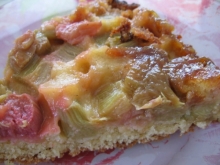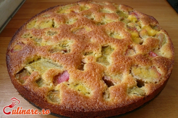 Se spala si se curata rubarba, apoi se taie cubulete. Intr-un castron, se pun ouale impreuna cu zaharul. Se bat cu mixerul, iar in acelasi timp, se adauga treptat laptele, uleiul, si zaharul vanilat. Faina impreuna cu praful de copt se adauga la final. Apoi, intr-o tava tapetata cu hartie de copt se toarna aluatul, iar pe deasupra se pun cubuletele de rubarba. Se introduce la cuptorul incalzit la 200 de grade timp de 30 de minute.
