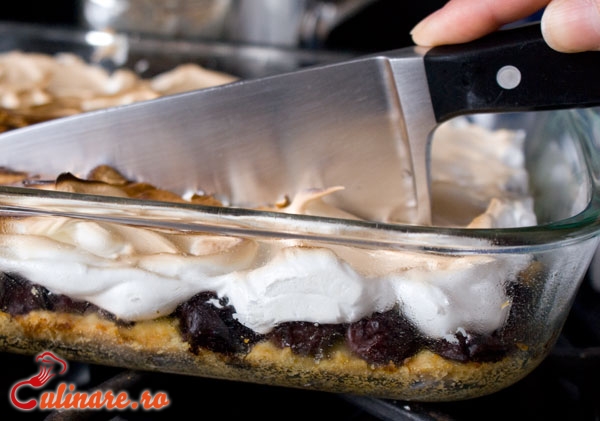 Intr-un bol se pun 200 de g de zahar impreuna cu untul si se mixeaza pana ce se transforma intr-o crema spumoasa. Peste acestea se pun galbenusurile celor 4 oua, praful de copt stins in zeama de lamaie, apa, si un praf de sare si se bat in continuare, pentru a le incorpora. Urmeaza faina, dar si zaharul vanilat. Toate acestea se amesteca bine, rezultand blatul pentru prajitura. Se tapeteaza o tava cu putin unt, in care se toarna aluatul preparat, peste blat se aseaza visinile spalate si curatate de samburi, in prealabil, astfel incat sa se acopere toata suprafata tavii si se da tava la cuptor, pentru aproximativ 25 de minute. Cat timp prajitura se rumeneste in cuptor, se bat albusurile spuma, cu restul de zahar, iar cand deja blatul incepe sa devina crocant, se scoate tava din cuptor pentru a intinde bezeaua deasupra, apoi se mai lasa la cuptor inca 10 minute. Cand e gata, se lasa la racit, apoi se portioneaza si se serveste.