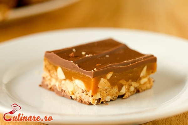 Blat: 8 albusuri 200 g zahar 200 g alune pisate 20 g faina 1 praf de copt Crema caramel: 8 galbenusuri 80 g zahar praf 100 g zahar tos 250 g unt 150 g alune prajute Glazura: 200 g ciocolata alba 200 g ciocolata 50 ml smantana frisca