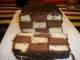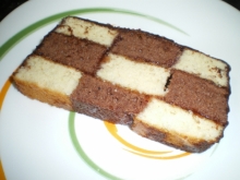 Untul se amesteca impreuna cu zaharul, apoi se adauga si ouale si se amesteca pana ce se incorporeaza totul. Aromatizam cu vanilie si coaja de lamaie, punem faina in ploaie si praful de copt, amestecam si obtinem un aluat omogen. Aluatul il impartim in doua parti egale, iar una din parti, o vom amesteca impreuna cu cele 50 de grame de cacao. Vom avea o compozitie alba si una neagra. Intr-o tava unsa cu unt, punem cate o lingura din compozitiile rezultate, alterand una alba cu una neagra, procedand asa, pana cand umplem tava. Dam tava la cuptor si coacem cam 25 de minute, iar cand se mai raceste, se scoate din tava, se portioneaza si se pudreaza cu zahar.