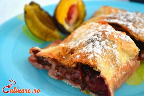 Aluatul pentru strudel se realizeaza asemenator celui de cozonac, amestecand faina impreuna cu laptele caldut, ouale batute spuma, zaharul, untul moale, uleiul, drojdia dizolvata in putina apa calda si un praf de sare. Din amestecul de ingrediente se framanta un aluat consistent, care va sta la dospit timp de aproape o ora. In acest timp se prepara umplutura, punand intr-o cratita feliile de prune, zaharul si zeama de la portocala, lasand pe foc pana ce incep sa fiarba. Amidonul se dizolva in putina apa calda, apoi se adauga peste prune si se amesteca mereu, pana cand continutul din cratita se ingroasa suficient. La final, se opreste focul, se adauga putina scortisoara si se lasa la racit. Cand a crescut suficient, aluatul se intinde pe masa de lucru, intr-o foaie de grosimea unui deget si se taie in doua parti egale. Peste fiecare foaie se intinde din umplutura de prune, se presara zahar vanilat si se ruleaza strudelele. Intr-o tava ce a fost tapetata cu unt si faina, se aseaza strudelele, apoi se ung deasupra cu ou si se presara zahar. Tava se da la cuptor, iar dupa aproximativ 40 de minute, cand s-au rumenit suficient, se scot din cuptor, se lasa la racit, apoi se feliaza si se servesc.