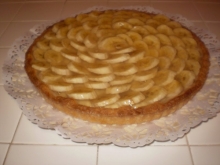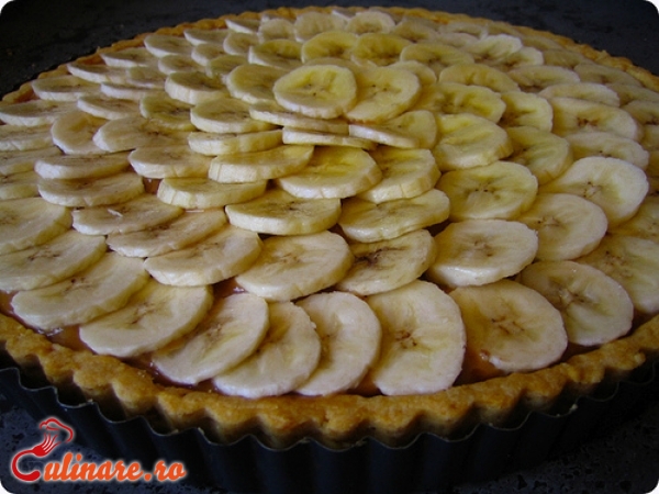 Aluatul de tarta: 3 pahare faina 1 1/2 lingurita rasa sare 3/4 pahar ulei 1 lingura unt moale sau margarina 5-6 linguri apa rece Umplutura: 2-3 banane 4 galbenusuri 2/3 pahar zahar 1/4 pahar amidon alimentar sau faina 1 varf de cutit sare 2 1/2-3 pahare lapte 2 linguri unt moale 2 pachetele zahar vanilat frisca batuta